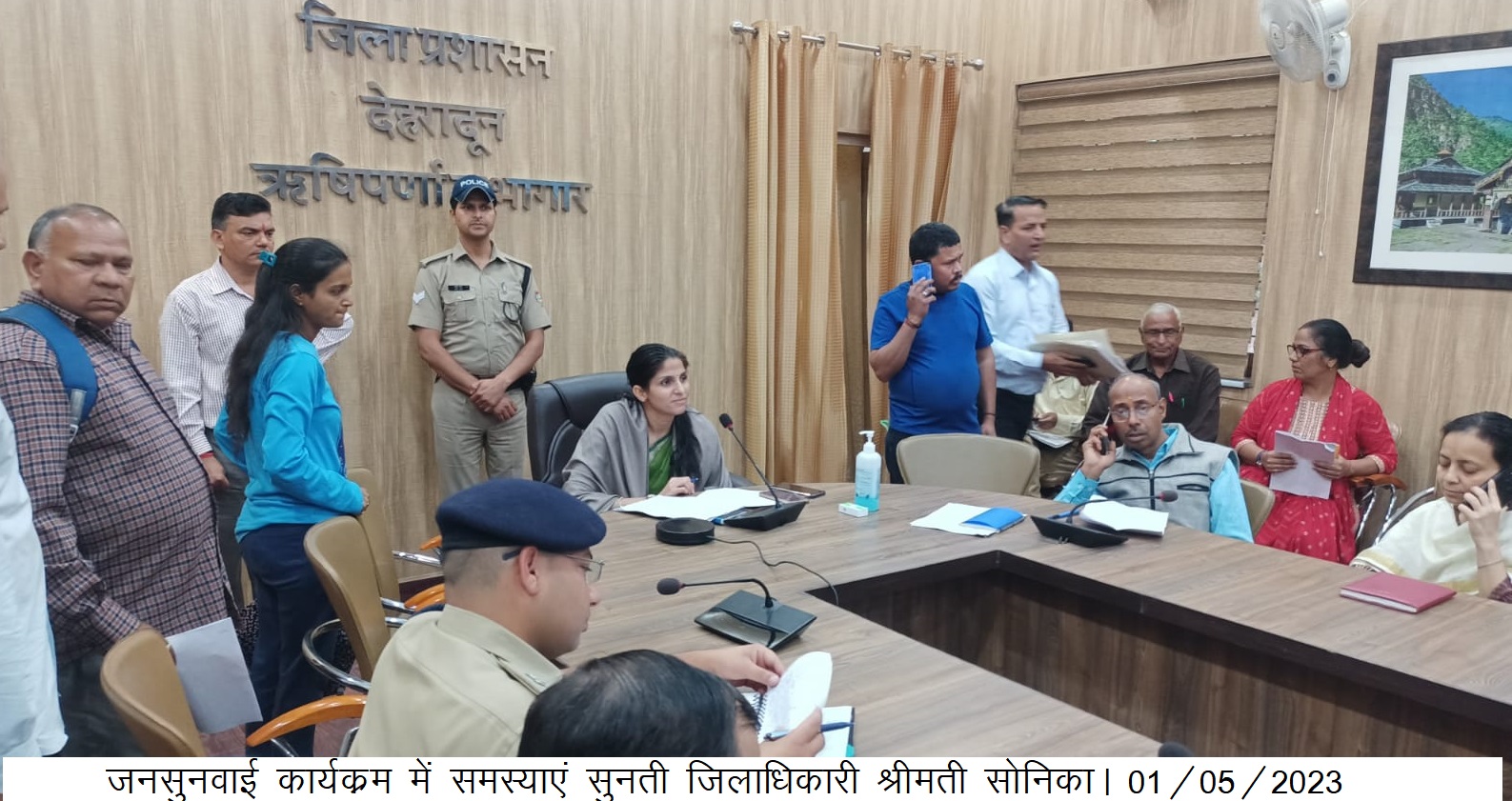 (जि.सू.का), देहरादून जिलाधिकारी सोनिका की अध्यक्षता में कलेक्ट्रेट में जनसुनवाई का आयोजन किया गया जिसमें 74 शिकायत प्राप्त हुई। शिकायतों में नगर निगम की भूमि पर कब्जा, सम्पति बटवारा विवाद, आर्थिक सहायता दिलाने, पुलिया निर्माण करवाने, स्कूल में दाखिला दिलाने, जाति प्रमाण पत्र बनवाने, आर्थिक सहायता दिलाने, अवैध खनन, वेतन दिलवाने, आदि शिकायतें प्राप्त हुई।