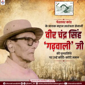 मुख्यमंत्री पुष्कर सिंह धामी ने कैंप कार्यालय में पेशावर कांड के महानायक वीर चंद्र सिंह गढ़वाली की पुण्यतिथि पर उन्हें श्रद्धा सुमन अर्पित करते हुए कहा कि वे वीरता की प्रतिमूर्ति एवं महान स्वाधीनता संग्राम सेनानी थे। उनकी शौर्य गाथा हमारी स्मृतियों में सदैव जीवंत रहेगी।