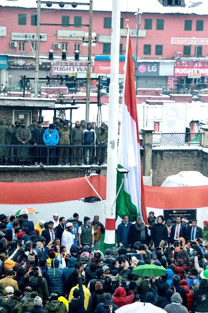 श्रीनगर : कांग्रेस नेता राहुल गांधी ने “भारत जोड़ो यात्रा” के समापन कार्यक्रम के अवसर पर श्रीनगर में कांग्रेस कार्यालय पर राष्ट्रध्वज फहराया। इस दौरान कांग्रेस अध्यक्ष मल्लिकार्जुन खड़गे, प्रियंका गांधी, उमर अब्दुल्ला , महबूबा मुफ्ती समेत कई कद्दावर नेता मौजूद रहे।