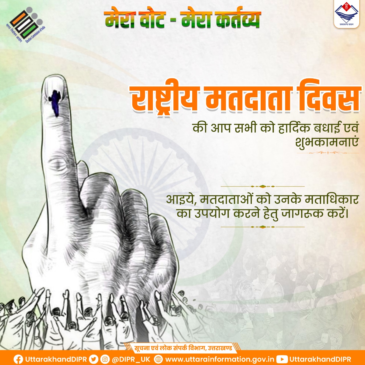 मुख्यमंत्री पुष्कर सिंह धामी ने “मतदाता दिवस” पर नागरिकों से अपील करते हुए कहा है कि, लोकतंत्र को और सशक्त बनाने के लिए मतदाताओं को अपने मत का प्रयोग करना चाहिए। लोगों को भी इसके लिए जागरूक करना हम सब का नैतिक दायित्व है।