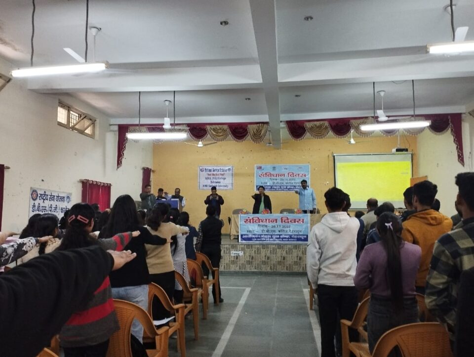 जिला युवा अधिकारी, नेहरू युवा केन्द्र देहरादून श्रीमती एम0 टोलिया ने बताया कि, युवा कार्यक्रम एवं खेल मंत्रालय, भारत सरकार के तत्वावधान में डी.बी.एस. कालेज, देहरादून के सभागार में ” संविधान दिवस कार्यक्रम” का आयोजन किया गया। कार्यक्रम के मुख्य अथिति डॉ. वी.सी.पाण्डे प्रचार्य डी.बी.एस. कालेज के द्वारा द्वीप प्रज्जवलन कर कार्यक्रम का शुभारम्भ किया ।