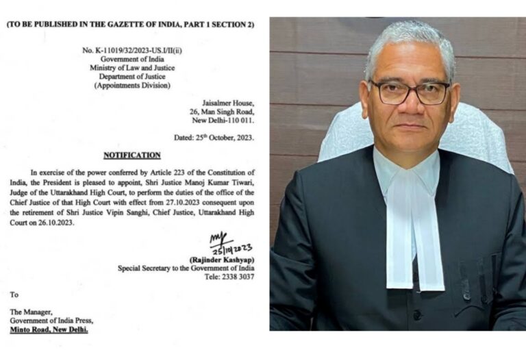 भारत की राष्ट्रपति द्रौपदी मुर्मू ने ऊत्तराखण्ड उच्च न्यायालय के मुख्य न्यायाधीश विपिन सांघी के 26 अक्टूबर को सेवानिवृत्त...