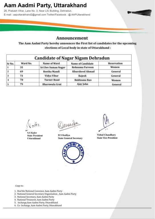 आम आदमी पार्टी ने आज उत्तराखण्ड नगर निकाय चुनावों को लेकर प्रदेश के हरिद्वार,देहरादून,देहरादून महानगर,कीर्तिनगर,डोईवाला, सहित विभिन्न जनपदों के अंतर्गत नगर पालिका परिषद और नगर पंचायत सहित अनेको पार्षद,सभासद और वार्ड मेम्बरों के नामो सहित कुल 35 लोगो की विधिवत रूप से घोषणा कर दी हैं।