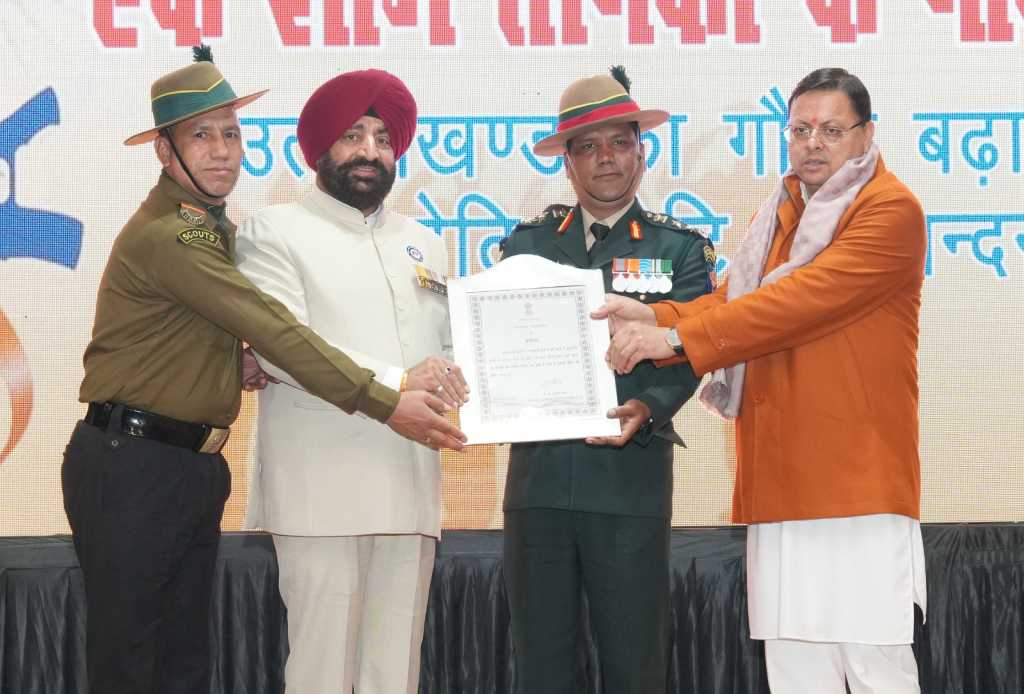 राज्यपाल लेफ्टिनेंट जनरल गुरमीत सिंह (से नि) एवं मुख्यमंत्री श्री पुष्कर सिंह धामी ने मंगलवार को सशस्त्र बल भूतपूर्व सैनिक दिवस (वेटरन्स डे) के अवसर पर राजभवन में सैनिक कल्याण विभाग द्वारा आयोजित ‘‘एक शाम सैनिकों के नाम’’ कार्यक्रम में प्रतिभाग किया। इस अवसर पर राज्यपाल और मुख्यमंत्री ने वीरता पदक विजेताओं और सराहनीय कार्य करने वाले पूर्व सैनिकों को सम्मानित किया। कार्यक्रम में अर्धसैनिक बल के जवानों और अधिकारियों को राज्यपाल प्रशंसा पत्र भी प्रदान किए गए।(सूची संलग्न) कार्यक्रम में कुमांऊ स्कॉउट्स, 4वीं बटालियन असम रेजिमेंट और 14वीं राजपूताना राइफल्स को भी उनके सराहनीय योगदान के लिए यूनिट प्रशंसा पत्र से सम्मानित किया गया।