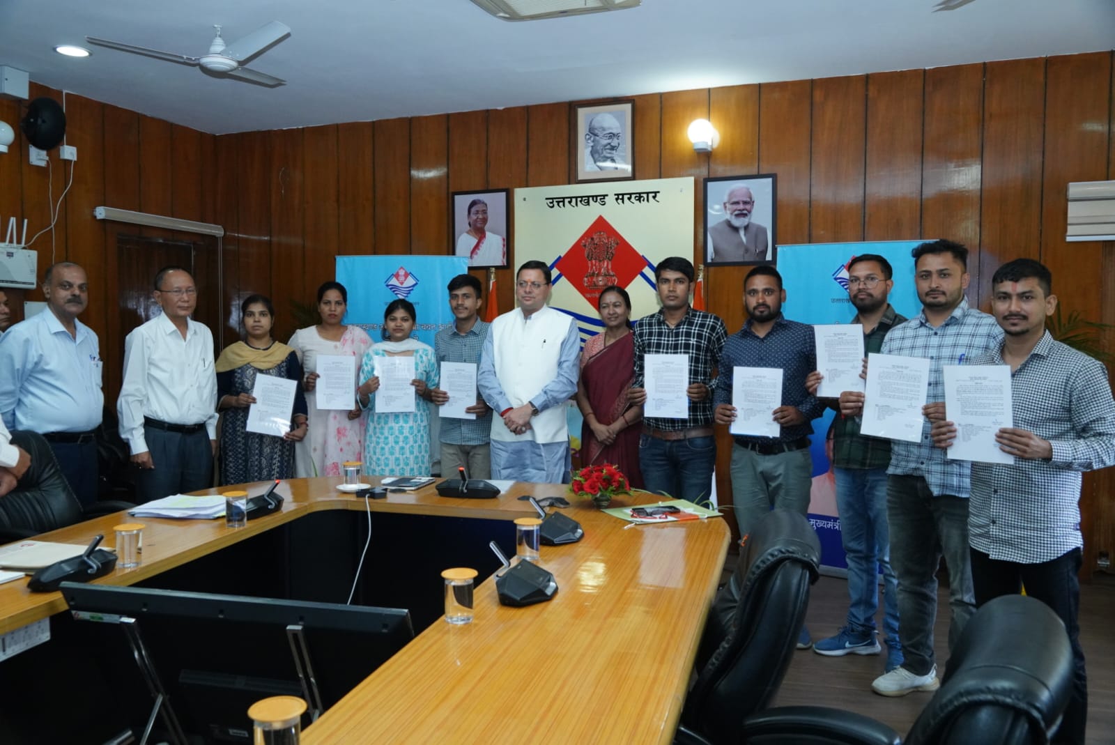 परिवहन विभाग के अन्तर्गत कनिष्ठ सहायक के पद पर उत्तराखण्ड अधीनस्थ सेवा चयन आयोग के माध्यम से चयनित 10 अभ्यर्थियों को सीएम पुष्कर सिंह धामी ने नियुक्ति पत्र प्रदान किये। सीएम धामी ने सभी अभ्यर्थियों को अपने कार्यक्षेत्र में पूरी ईमानदारी और कर्तव्यनिष्ठा के साथ काम करने का विश्वास दिलाया साथ ही उन्होंने कहा की जीवन की शुरूआत आत्म अनुशासन और नियमित दिनचर्या के साथ करें।