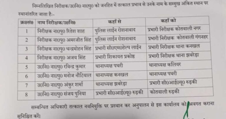 हरिद्वार पुलिस महकमे में फेरबदल, कई थाना प्रभारियों के तबादले! हरिद्वार जिले में कानून व्यवस्था को और मजबूत करने के...