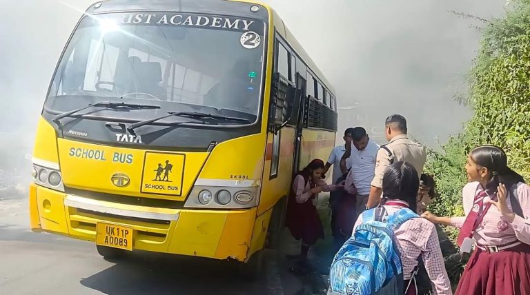 चमोली: स्कूल बस में लगी आग, खाकी वर्दी बना फरिश्ता