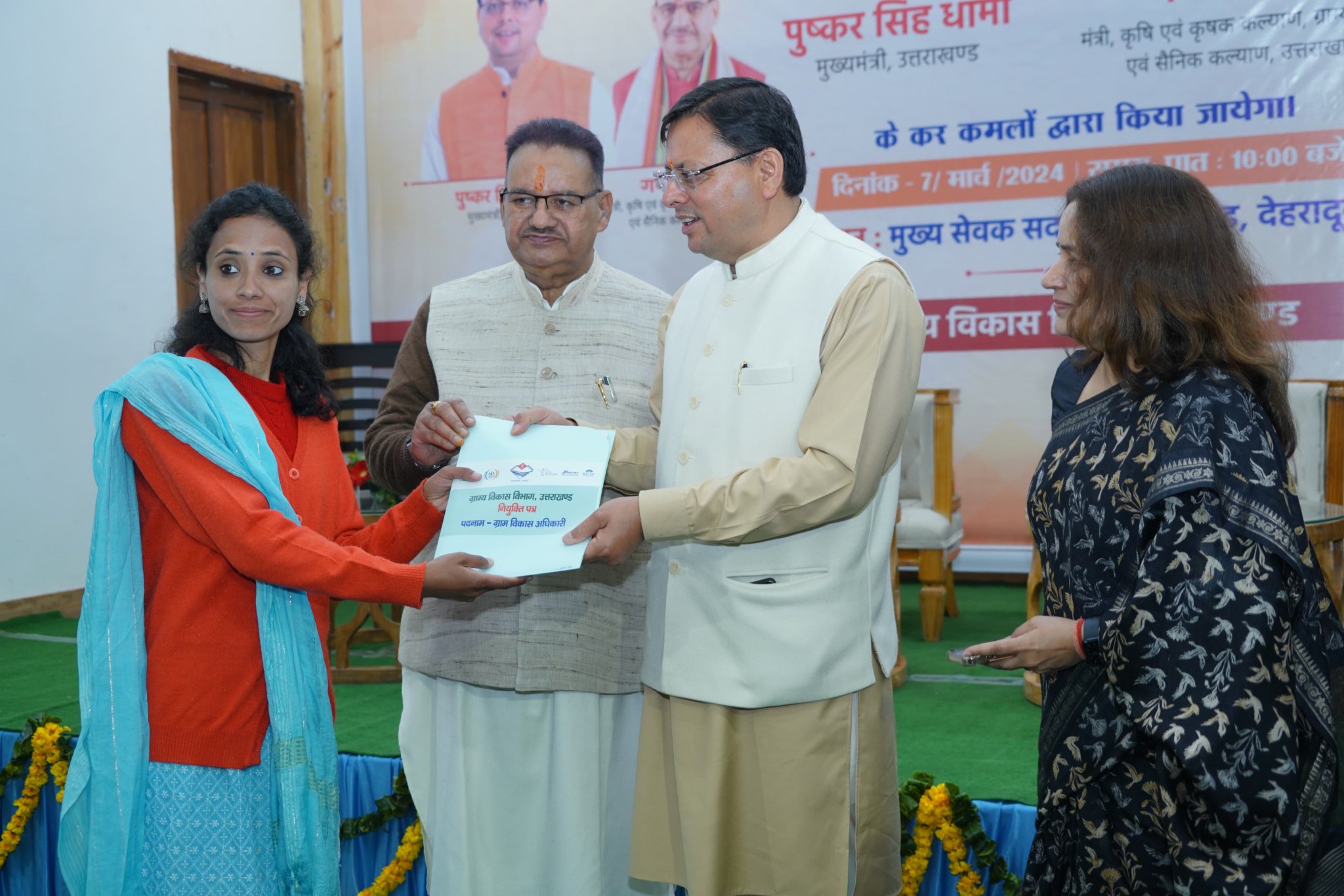 देहरादून, मुख्यमंत्री पुष्कर सिंह धामी ने आज मुख्य सेवक सदन में ग्राम विकास विभाग के अंतर्गत अधीनस्थ चयन सेवा आयोग के माध्यम से चयनित 394 ग्राम विकास अधिकारियों के पद पर नियुक्त अभ्यर्थियों को नियुक्ति पत्र प्रदान किए।