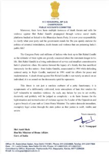 कांग्रेस महासचिव केसी वेणुगोपाल ने सरकार को कड़ा संदेश देते हुए कहा है कि इस मामले में किसी भी तरह की ढिलाई बर्दाश्त नहीं की जाएगी। उन्होंने कहा कि सत्तारूढ़ पार्टी के प्रवक्ता द्वारा खुलेआम मौत की धमकी देना एक भयावह साजिश की ओर इशारा करता है। पत्र के अंत में उन्होंने साफ लिखा, ‘यदि आप शीघ्रता से, निर्णायक रूप से और सार्वजनिक रूप से कार्रवाई करने में विफल रहते हैं, तो इसे मिलीभगत माना जाएगा और इसे विपक्ष के नेता के खिलाफ हिंसा को वैध बनाने का लाइसेंस समझा जाएगा।
