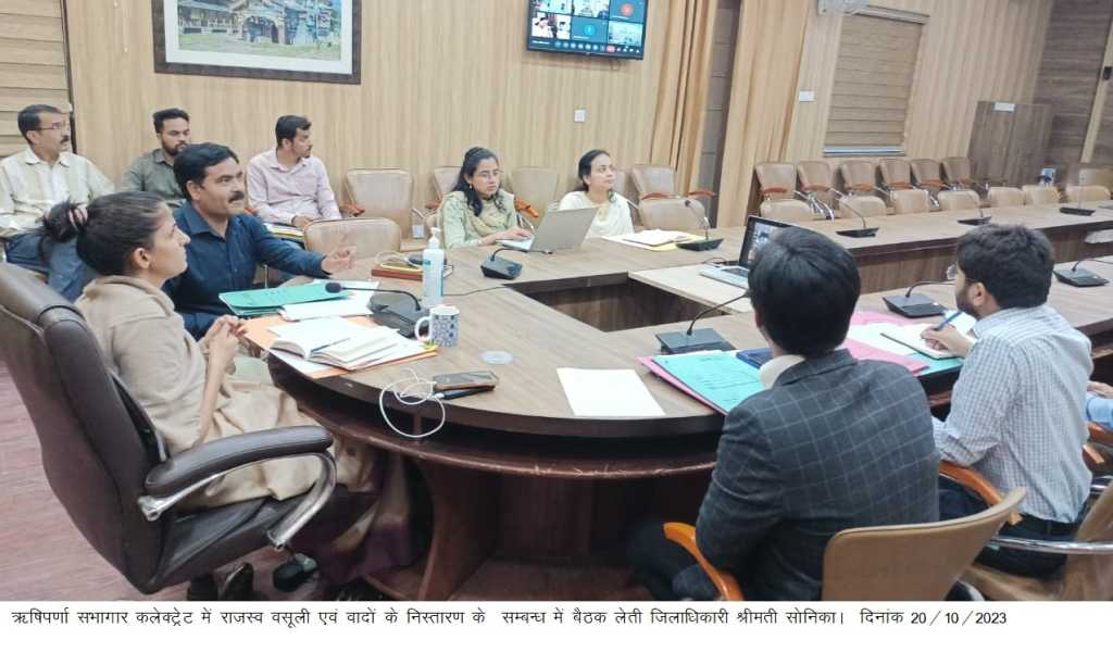 जिलाधिकारी सोनिका ने ऋषिपर्णा सभागार कलेक्टेªट में राजस्व वसूली के सम्बन्ध में बैठक लेते हुए समस्त उप जिलाधिकारियों को राजस्व वसूली बढाने तथा वादों को तेजी से निस्तारण के निर्देश दिए। जिलाधिकारी ने समस्त उप जिलाधिकारियों को राजस्व वादों के निस्तारण एवं राजस्व वसूली की अपने स्तर पर समीक्षा करने के निर्देश दिए।