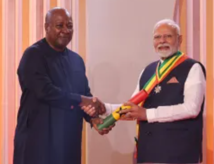 प्रधानमंत्री नरेन्द्र मोदी इन दिनों आठ दिवसीय विदेश यात्रा पर हैं। बीते दिन प्रधानमंत्री मोदी राजकीय यात्रा पर घाना पहुंचे । यहां उन्होंने घाना के राष्ट्रपति डॉ. जॉन ड्रामानी महामा से भेंट की। जुबली हाउस पहुंचने पर राष्ट्रपति महामा ने श्री मोदी का स्वागत किया। तीन दशकों में किसी भारतीय प्रधानमंत्री की यह पहली यात्रा है।