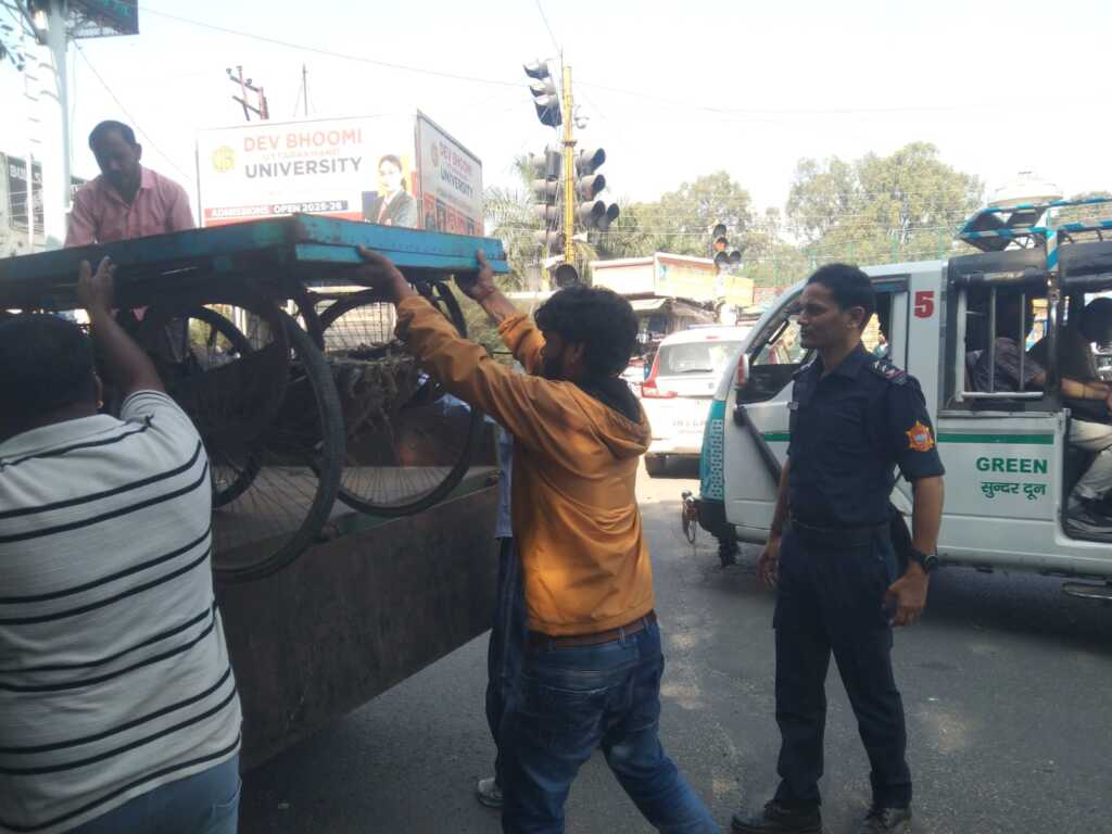 इसी क्रम में आज दिनाँक 27/10/2025 को यातायात पुलिस देहरादून द्वारा नगर निगम के साथ परेड ग्राउण्ड के चारों ओर (कनक चौक/ ओरियण्ट चौक/ लैंसडाउन चौक/ दर्शनलाल चौक) आदि स्थानो पर, ऐसे दुकानदारों/रेहडी/ठेली आदि, जिनके द्वारा अपनी दुकान का सामान बाहर सडक पर रखकर अवैध अतिक्रमण करते हुए यातायात व्यवस्था को बाधित किया जा रहा था, के विरुद्ध कार्यवाही करते हुए 20 दुकानदारों/ठेली/रेहडी संचालकों के सामान को जब्त करते हुए नगर निगम द्वारा अपने कब्जे में लिया गया।