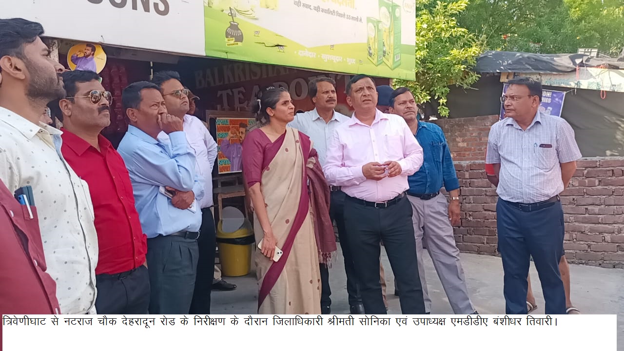जिलाधिकारी सोनिका एवं उपाध्यक्ष एमडीडीए बंशीधर तिवारी ने संयुक्त रूप से त्रिवेणी घाट का एवं त्रिवेणीघाट से नटराज चौक तक देहरादून रोड पर पैदल निरीक्षण कर जी-20 कार्यक्रम की तैयारियों का जायजा लिया। इस दौरान जिलाधिकारी ने गंगा सभा समिति के प्रतिनिधियों के साथ बैठक कर गंगा आरती के दौरान किये जाने वाले आयोजन की व्यवस्था के सम्बन्ध में विस्तार से चर्चा की गई।