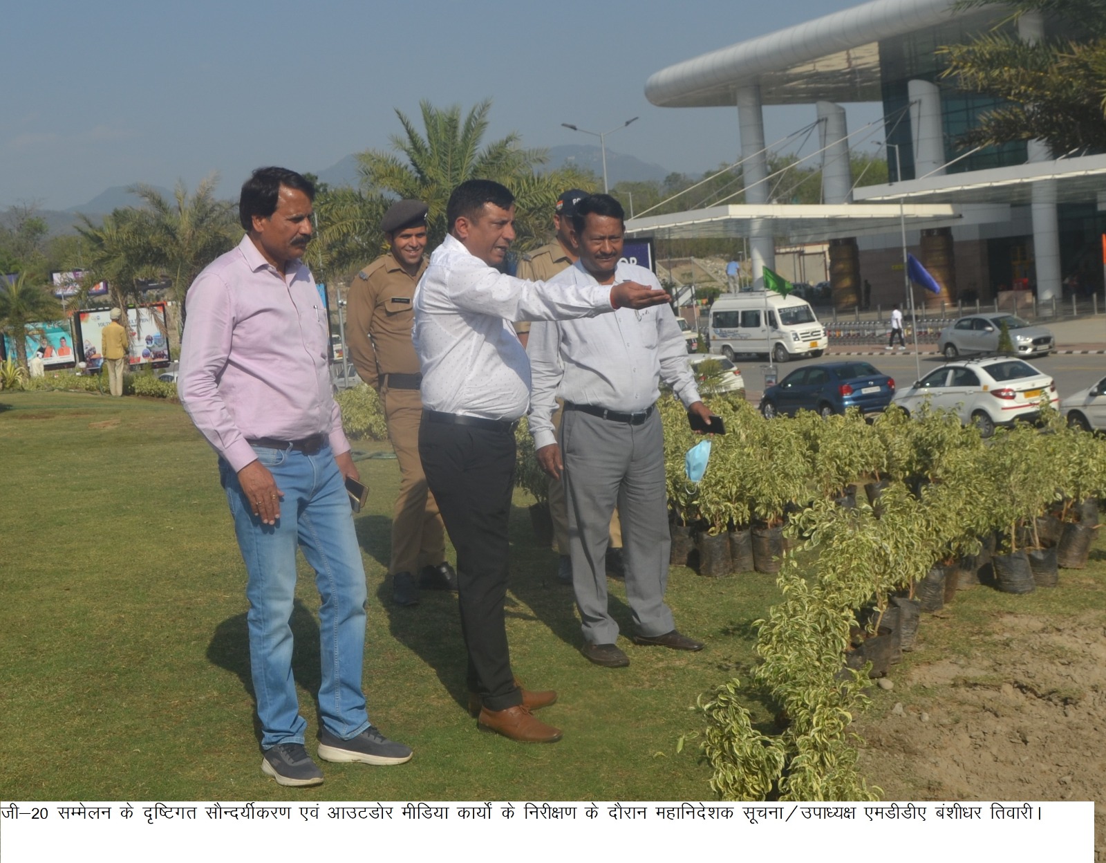 देहरादून में जी-20 सम्मेलन के आयोजन की तैयारियों के दृष्टिगत महानिदेशक सूचना एवं उपाध्यक्ष एमडीडीए बंशीधर तिवारी ने आज जौलीग्रान्ट एयरपोर्ट पर सौन्दर्यीकरण एवं आउटडोर मीडिया का निरीक्षण किया। उन्होंने एमडीडीए द्वारा किये जा रहे पुष्पवाटिका एवं सौन्दर्यीकरण कार्यों का अवलोकन करते हुए, उपस्थित अधिकारियों से कहा कि कार्यों में किसी प्रकार की त्रुटि न हो इस बात को गंभीरता से लिया जाए और कार्यों को निर्धारित समय पर पूर्ण करेंगे।