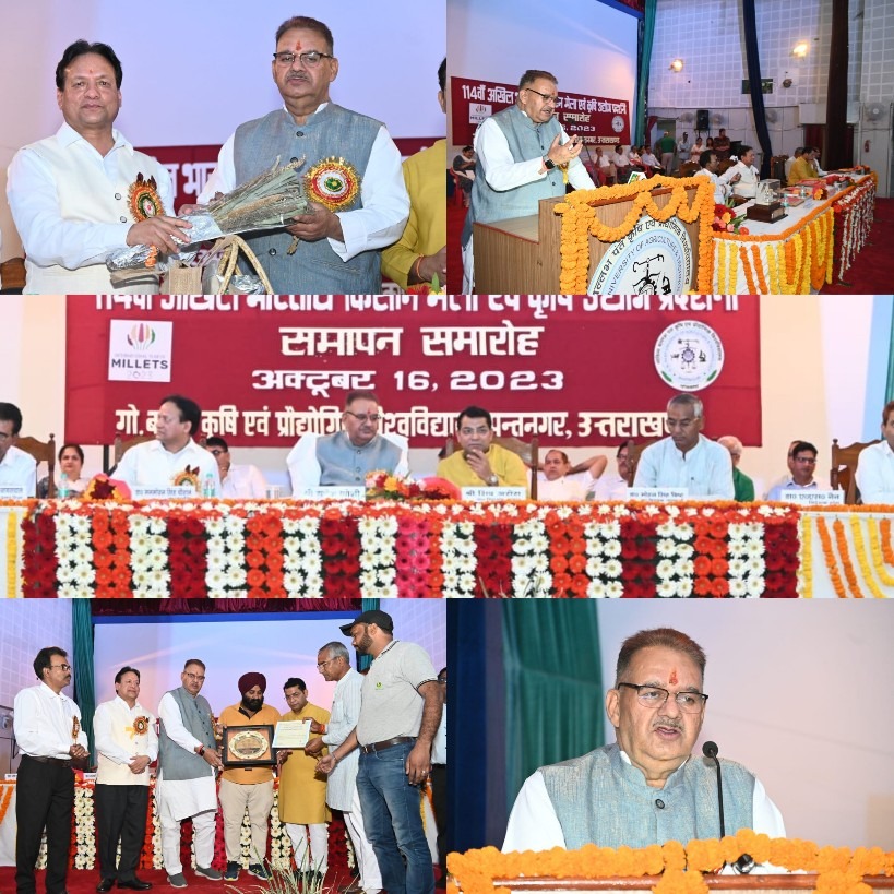 प्रदेश के कृषि एवं कृषक कल्याण मंत्री गणेश जोशी ने सोमवार को पंतनगर स्थित गांधी सभागार में आयोजित चार दिवसीय 114वां अखिल भारतीय किसान मेला एवं कृषि उद्योग प्रदर्शनी के समापन समारोह में बतौर मुख्य अतिथि प्रतिभाग किया। कार्यक्रम में मुख्य अतिथि कृषि मंत्री गणेश जोशी का कृषि वैज्ञानिकों द्वारा तैयार मिलेट्स का पुष्प गुच्छ देकर स्वागत अभिनंदन किया किया। इस दौरान नेपाल और गोविंद बल्लभ पंत यूनिवर्सिटी के बीच समझौता हस्ताक्षर भी किया गया। इस अवसर पर कृषि मंत्री गणेश जोशी ने स्वयं सहायता समूहों को प्रमाण पत्र वितरित करने के साथ ही समारोह में लगाएं गए स्टॉल चालकों को सम्मानित किया गया।