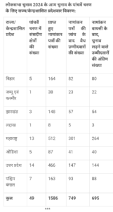 पांचवें चरण में, महाराष्ट्र के 13 संसदीय क्षेत्रों में अधिकतम 512 नामांकन-पत्र दाखिल किए गए थे। इसके बाद, उत्तर प्रदेश के 14 संसदीय क्षेत्रों में 466 नामांकन-पत्र दाखिल किए गए थे। झारखंड के 4-चचरा संसदीय क्षेत्र में सबसे अधिक 69 नामांकन-पत्र प्राप्त हुए और इसके बाद उत्तर प्रदेश के 35-लखनऊ संसदीय क्षेत्र में 67 नामांकन-पत्र प्राप्त हुए। पांचवें चरण के लिए एक संसदीय क्षेत्र में चुनाव लड़ने वाले उम्मीदवारों की औसत संख्या 14 है।