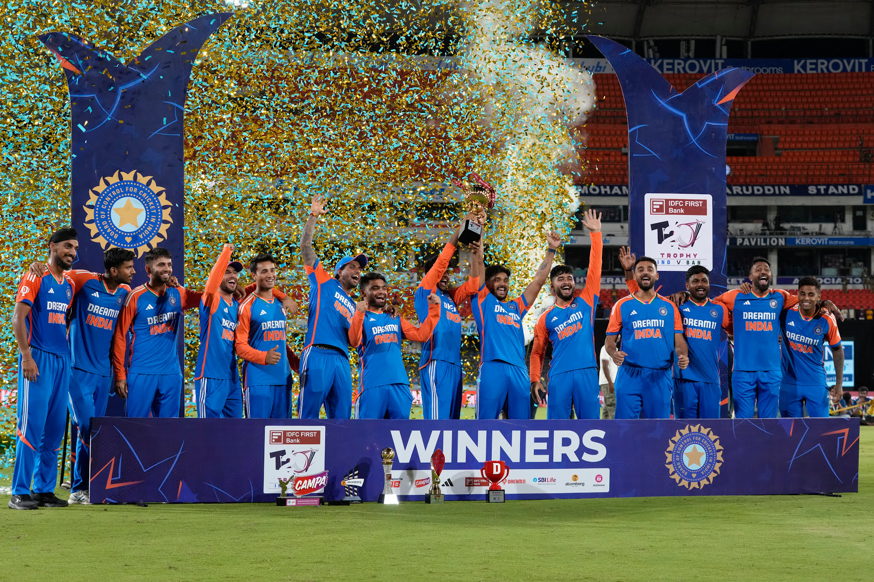 Indian players celebrate with the trophy after winning the T20 cricket series against Bangladesh in Hyderabad, India, Saturday, Oct. 12, 2024. (AP Photo/Mahesh Kumar A.)