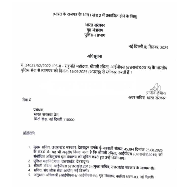 नई दिल्ली। केंद्र सरकार ने उत्तराखंड कैडर की आईपीएस अधिकारी (2015 बैच) श्रीमती रचिता का भारतीय पुलिस सेवा से इस्तीफा स्वीकार कर लिया है। गृह मंत्रालय की ओर से जारी अधिसूचना के अनुसार, राष्ट्रपति ने श्रीमती रचिता के त्यागपत्र को 16 सितंबर 2025 से प्रभावी (अपराह्न) स्वीकार किया है।