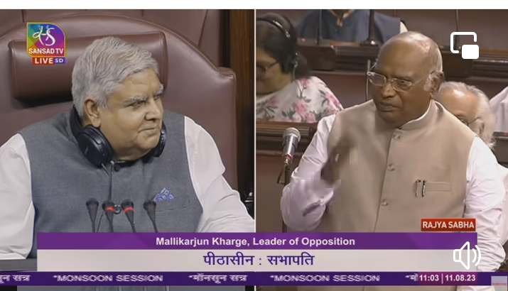 कांग्रेस के राष्ट्रीय अध्यक्ष मलिकार्जुन खड़गे ने राज्यसभा में वक्तव्य देते हुए कहा कि,आज सदन का अंतिम दिन है। मेरी विनती है कि आज माइक जल्दी बंद न करें। उन्होंने स्पीकर का ध्यान आकर्षित करते हुए बताया कि इस सदन में कई लोगों को निलंबित किया गया है, प्रिविलेज कमेटी को रेफर किया गया। अधीर रंजन चौधरी को भी निलंबित किया गया। ऐसा ठीक नहीं है, हमें लोकतंत्र की रक्षा करनी है।