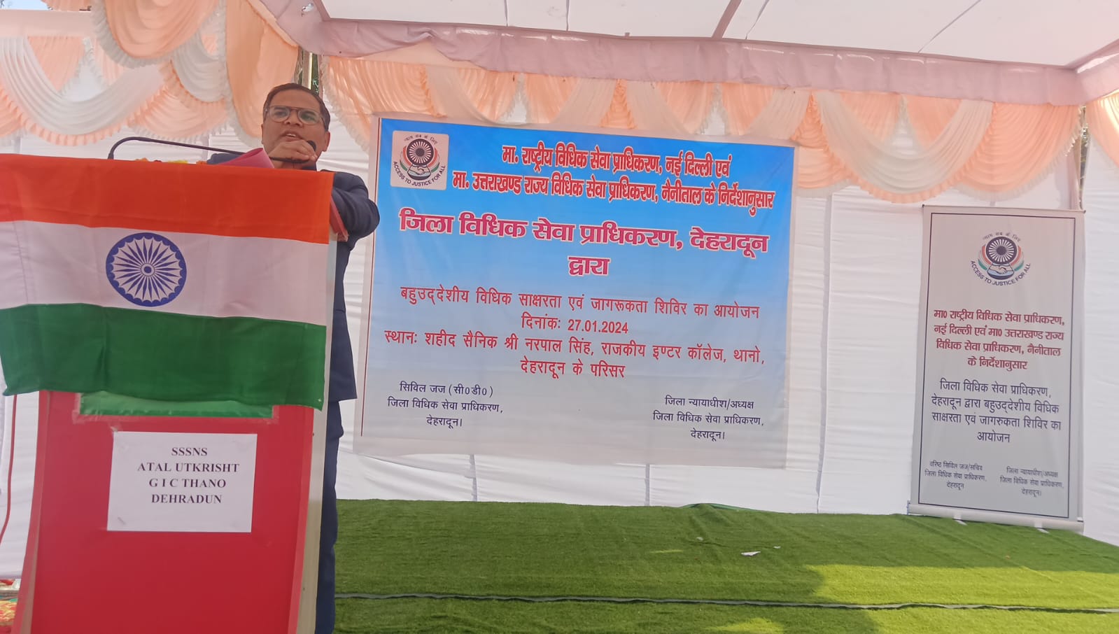 देहरादून, जिला विधिक सेवा प्राधिकरण, देहरादून के तत्वावधान में शहीद सैनिक नरपाल सिंह राजकीय इंटर कॉलेज थानों, देहरादून, उत्तराखंड के परिसर में बहुउद्देशीय विधिक साक्षरता एवं जागरूकता शिविर का आयोजन किया गया। शिविर का शुभारम्भ वरिष्ठ सिविल जज एवं सचिव जिला विधिक सेवा प्राधिकरण, देहरादून हर्ष यादव, एवं अन्य अधिकारीगण द्वारा दीप प्रज्वलन से किया तथा शहीद सैनिक श्री नरपाल सिंह राजकीय इंटर कॉलेज थानों के छात्रों द्वारा द्वारा स्वागत गान प्रस्तुत किया गया तथा विद्यालय के अध्यापक आनन्द सिंह चौहान द्वारा सभी अतिथियों का स्वागत किया गया।