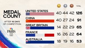 The United States and China will both end the Paris Olympics with 40 gold medals each. The U.S. won the total medal count with 126 (40 gold, 44 silver, and 42 bronze). China came in second in the total medal race with 91 (40 gold, 27 silver, and 24 bronze).