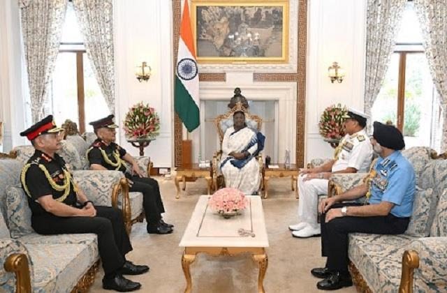 भारत-पाकिस्तान के बीच सीजफायर होने के बाद राष्ट्रपति द्रौपदी मुर्मू से बुधवार को चीफ ऑफ डिफेंस स्टाफ सीडीएस जनरल अनिल चौहान और थल, वायु और नौसेना प्रमुखों ने मुलाक़ात की। इस दौरान सीडीएस ने भारत द्वारा किए गए ‘ऑपरेशन सिंदूर’ की विस्तृत जानकारी उन्हें दी। भारत ने 22 अप्रैल को पहलगाम में हुए आतंकवादी हमले के जवाब में ‘ऑपरेशन सिंदूर’ के तहत छह और सात मई की अर्धरात्रि को पाकिस्तान में 9 आतंकवादी ठिकानों को एयर स्ट्राइक से नेस्तनाबूद कर दिया गया।