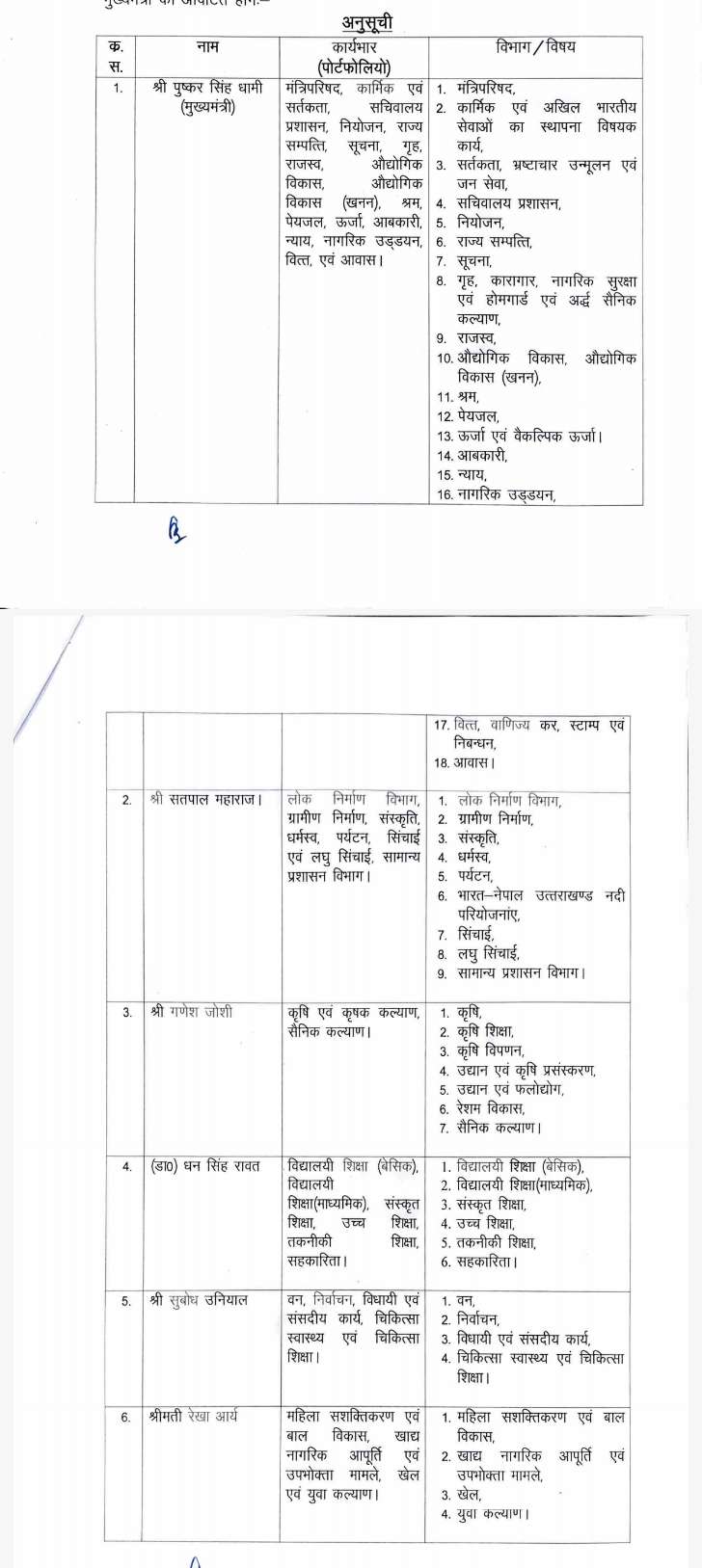 उत्तराखंड कैबिनेट मंत्रियों के विभागीय आवंटन की विस्तृत सूची