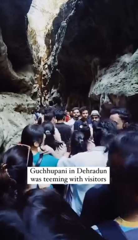हाल ही में उत्तराखंड के देहरादून के गुच्चू पानी गुफा का एक वीडियो सामने आया है। जिसमें देखा जा सकता है कि वहां पर हजारों टूरिस्ट एक साथ पहुंच गए हैं और उस दो पहाड़ियों के बीच बनी संकरी जगह से निकलने की कोशिश कर रहे हैं। इस वीडियो में पुरुष, महिला और बच्चे, बुजुर्ग सभी कतार में लगकर गुफा को पार करते हुए दिख रहे हैं। इस वीडियो को वायरल होने पर सोशल मीडिया पर यूजर्स प्रशासन पर सवाल खड़ा कर रहे हैं।ये देखकर ही दम घुट रहा है’