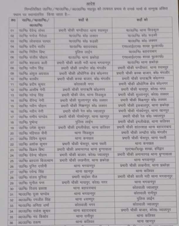 वरिष्ठ पुलिस अधीक्षक हरिद्वार द्वारा जिले में व्यापक स्तर पर प्रशासनिक फेरबदल किया गया है। पुलिस कार्यप्रणाली को और अधिक सशक्त बनाने तथा कानून-व्यवस्था को सुदृढ़ बनाए रखने के उद्देश्य से 36 उपनिरीक्षकों (उ०नि०), मुख्य आरक्षी (म०उ०नि०) एवं आरक्षी (अ०उ०नि०) को इधर से उधर स्थानांतरित किया गया है। यह आदेश तत्काल प्रभाव से लागू कर दिया गया है