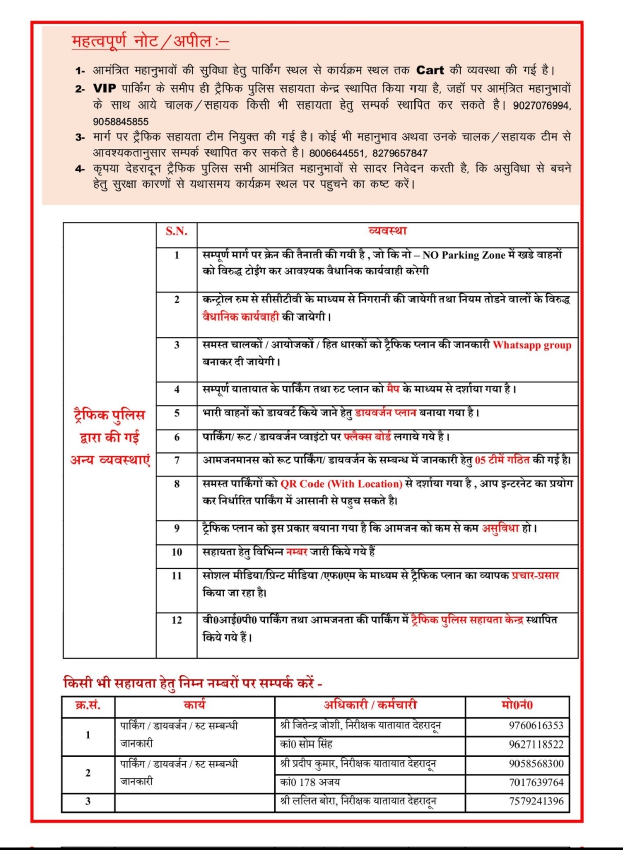 – मसूरी, राजपुर क्षेत्र से आने वाले अतिथि राजपुर रोड, दिलाराम चौक, हाथीबड़कला, एनेक्सी तिराहा, सीएसडी तिराहा, कैंट चौक, कौलागढ़ चौक, कौलागढ़ गेट, एफआरआई से पार्किंग स्थल आएंगे।